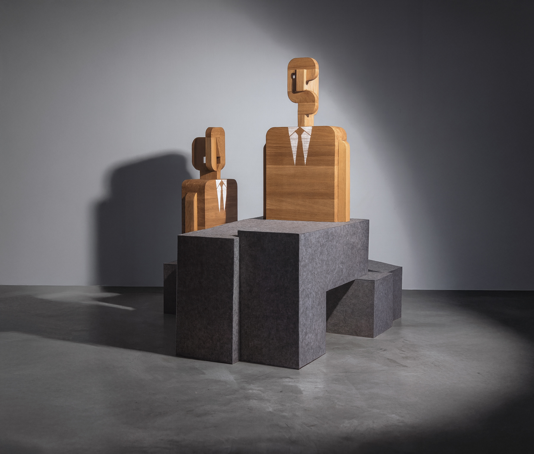But who is this character? Who is the man persistently using objects, allowing himself to be humiliated, to assume uncomfortable poses? Over time, his suit grew more wrinkled, more carelessly worn. He is Everyman — a metaphor for the ordinary citizen, consumer, voter, or petitioner. A driver, passer-by, client, and worker. Like a character from Tadeusz Różewicz’s writings, he is stripped of distinct traits yet represents the condition of being human, defined by context and the viewer’s own sensitivity.