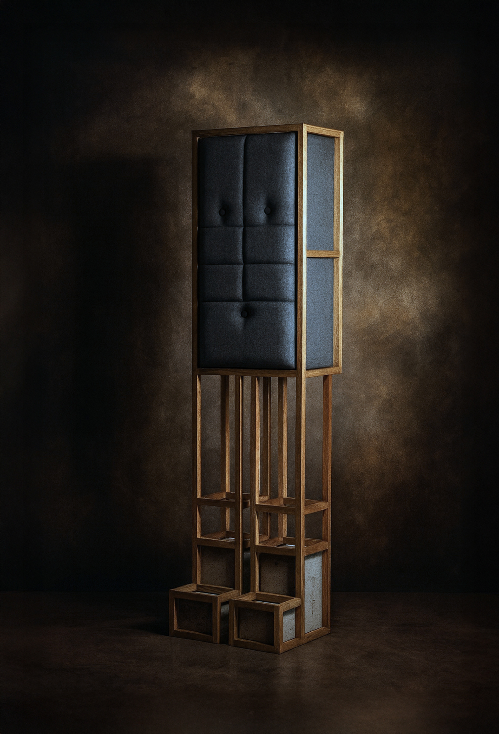 The exhibition situates used pieces of furniture and interior-objects—many sourced from the archives of Cricoteka—into a new configuration that plays with scale, materiality, and function. In so doing, it stages a reversal: the furniture becomes actor, the human becomes stage-prop, and the space of living becomes a sculptural field of relational power and memory.”