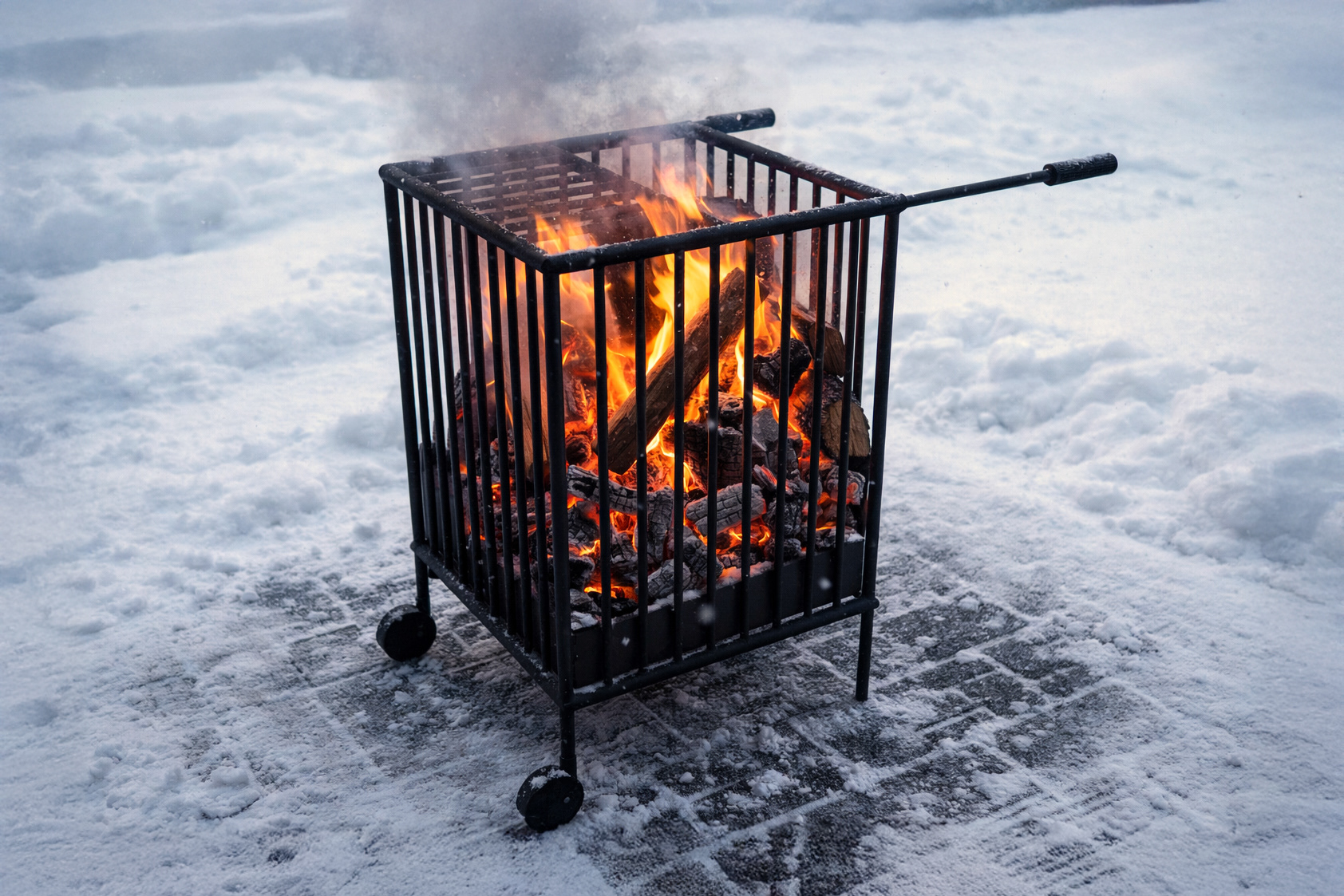The coke brazier was created for the exhibition Just a Thing, curated by Agnieszka Jacobson-Cielecka, which invited designers to reinterpret an ordinary object within clearly defined design constraints. Participants were asked to adapt their works to a standardized crate, establishing a shared formal and logistical framework. Referencing the classic form of a coke brazier, the object is enhanced with mobility, a grill, and a pull-out handle that also functions as a coal poker, balancing between a familiar archetype and a contemporary reflection on function and use.