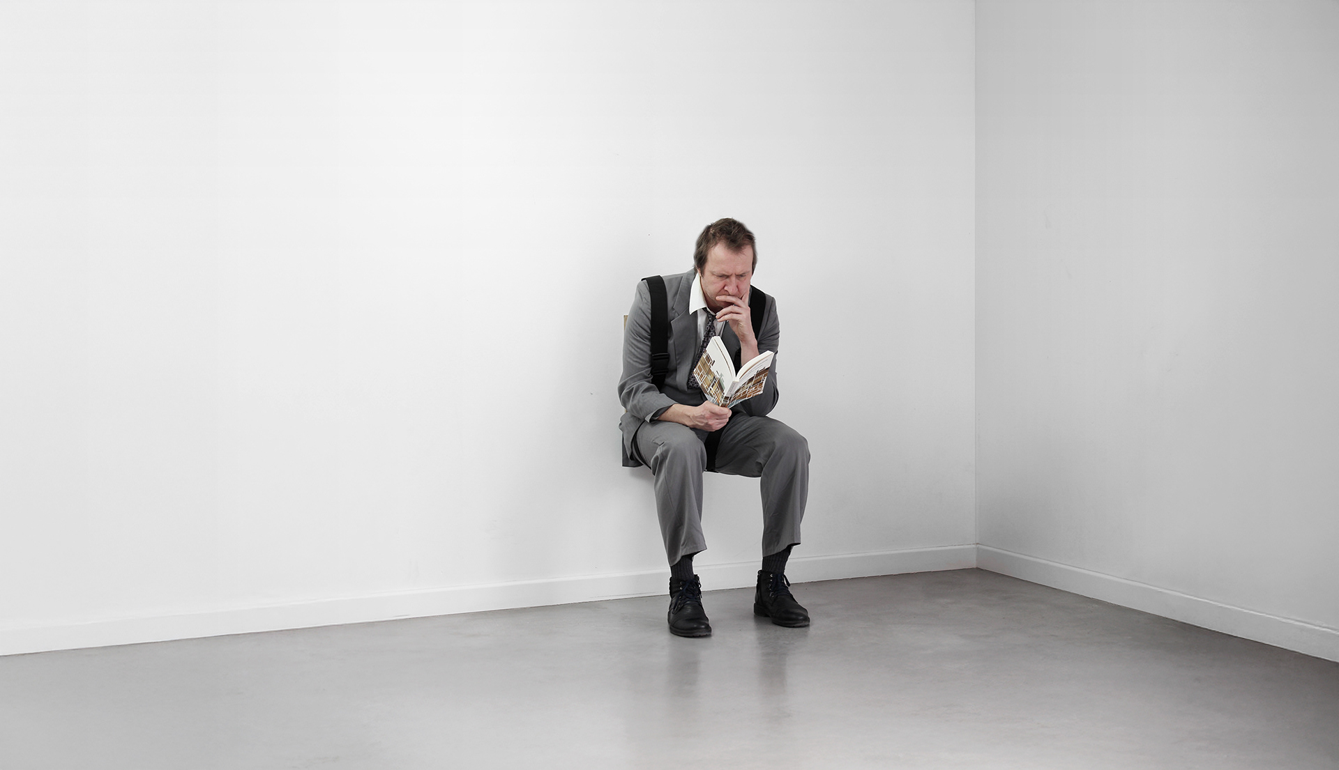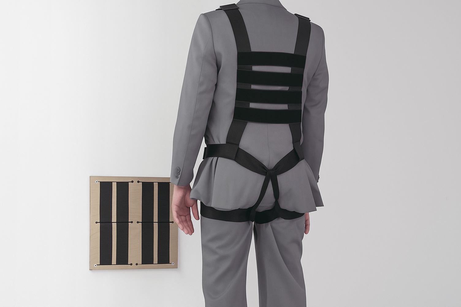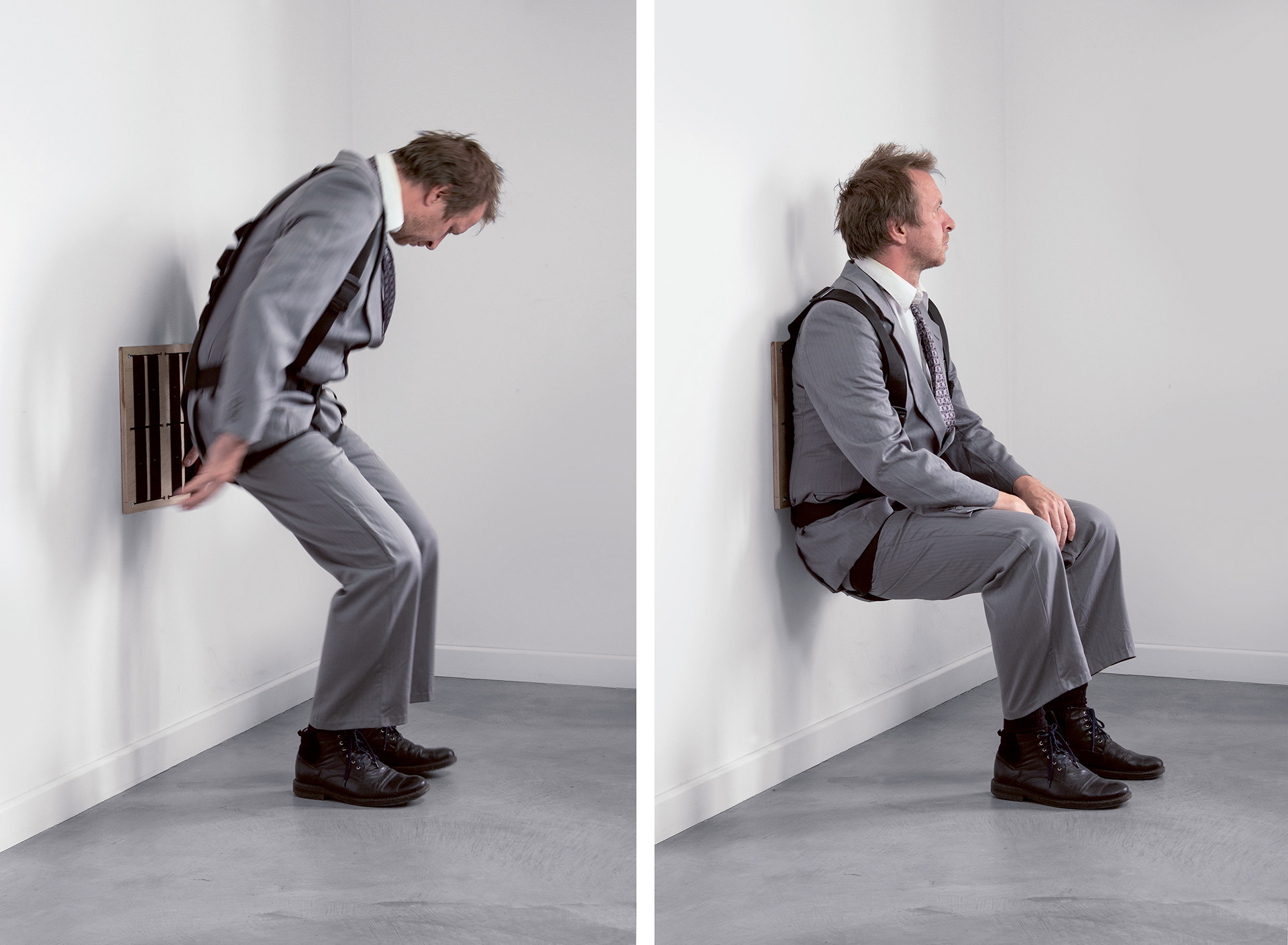 It’s a radical project that started from the idea of eliminating all furniture. For example, a “chair” could be achieved simply by sitting against a wall with bent knees. Of course, this is intriguing but also very tiring, so the idea emerged to design a special harness with Velcro straps that would firmly hold a person in the desired sitting position.