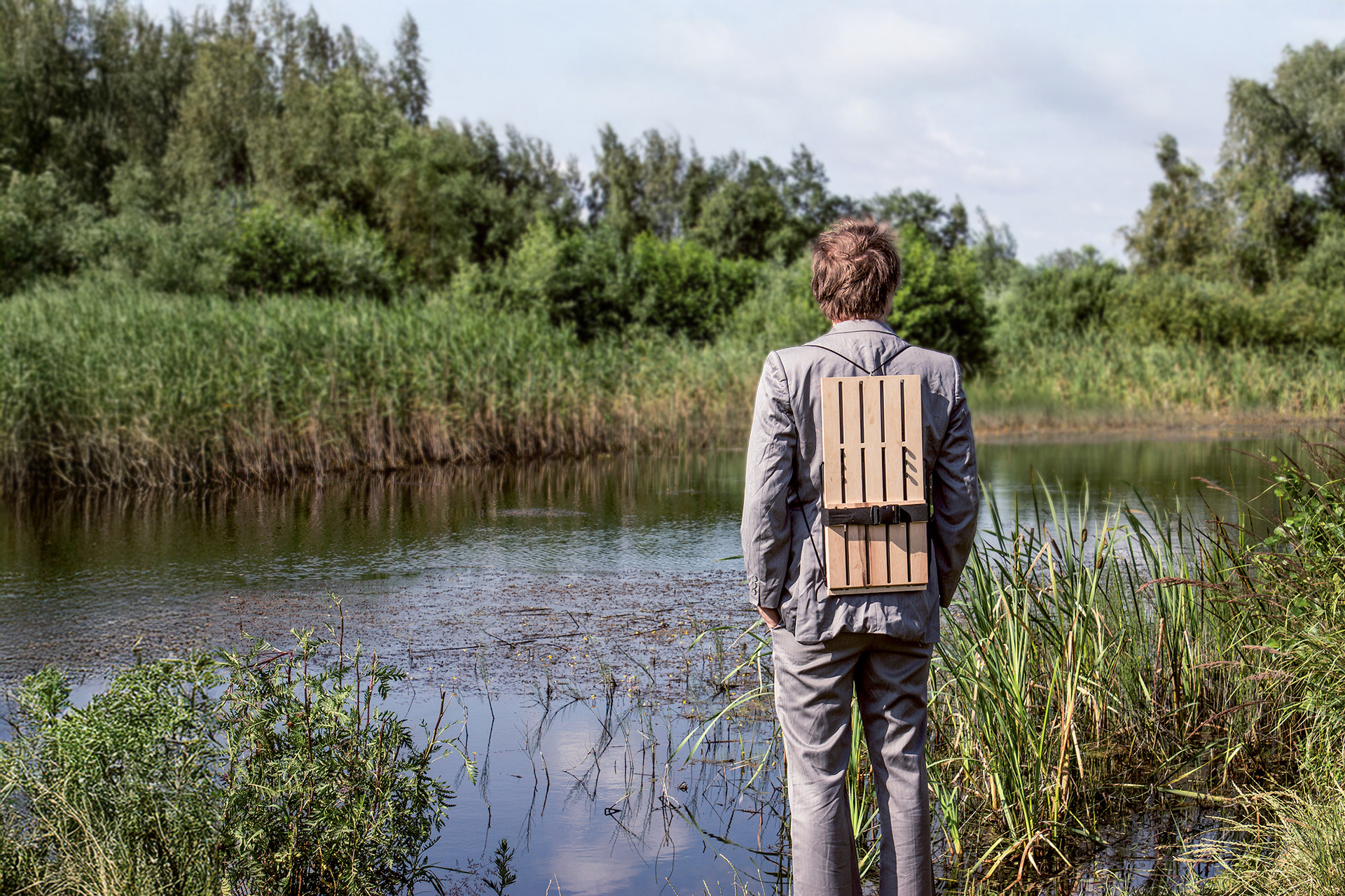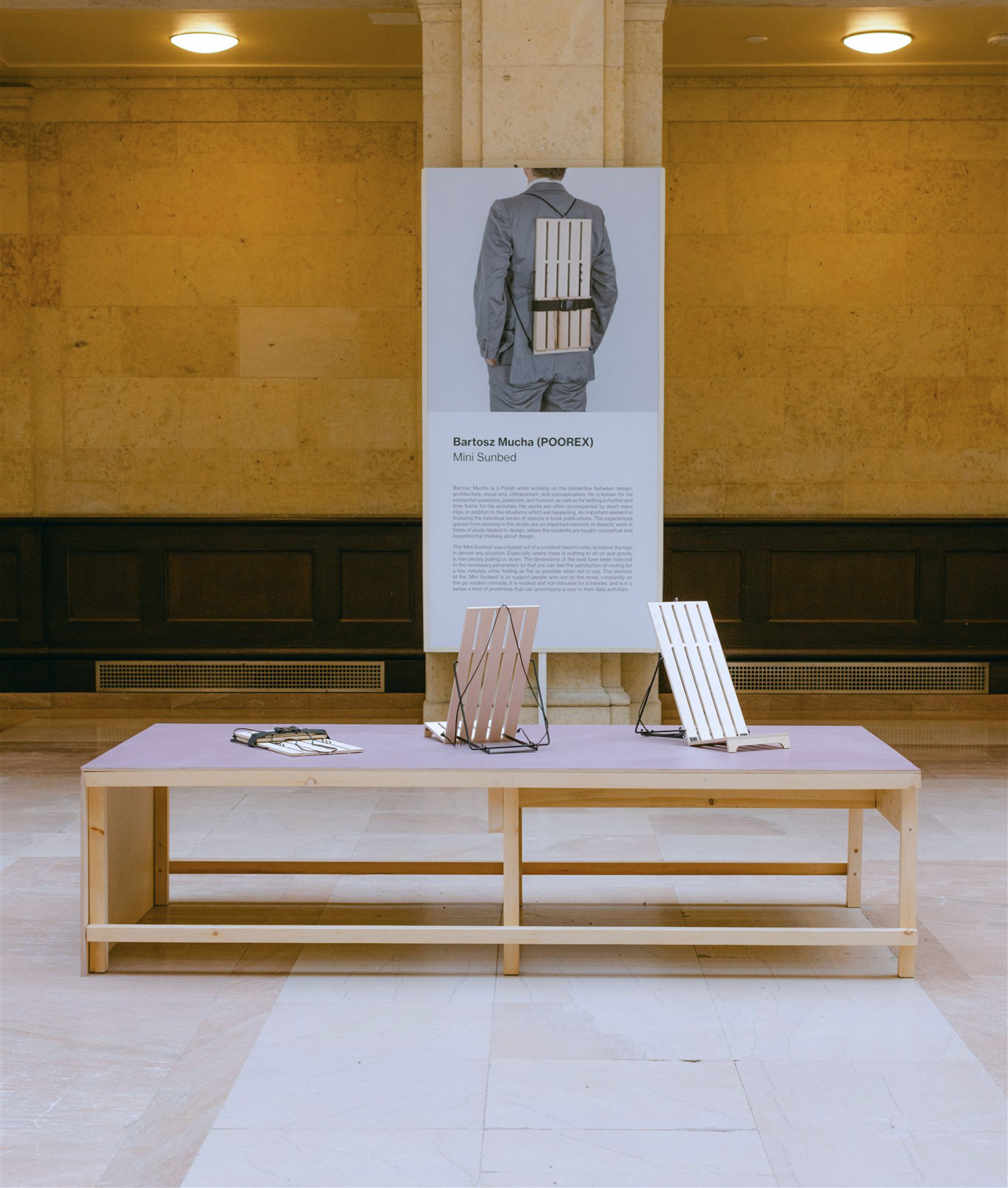 A small, foldable lounge chair designed to remain completely unobtrusive while being carried — worn like a comfortable backpack. Whenever one feels the need to rest their legs in an informal setting, it can be effortlessly taken off, unfolded, and used immediately. A set of three mini sunbeds was showcased in February 2025 at the DesignTO Festival in Toronto, within the Dwell exhibition.