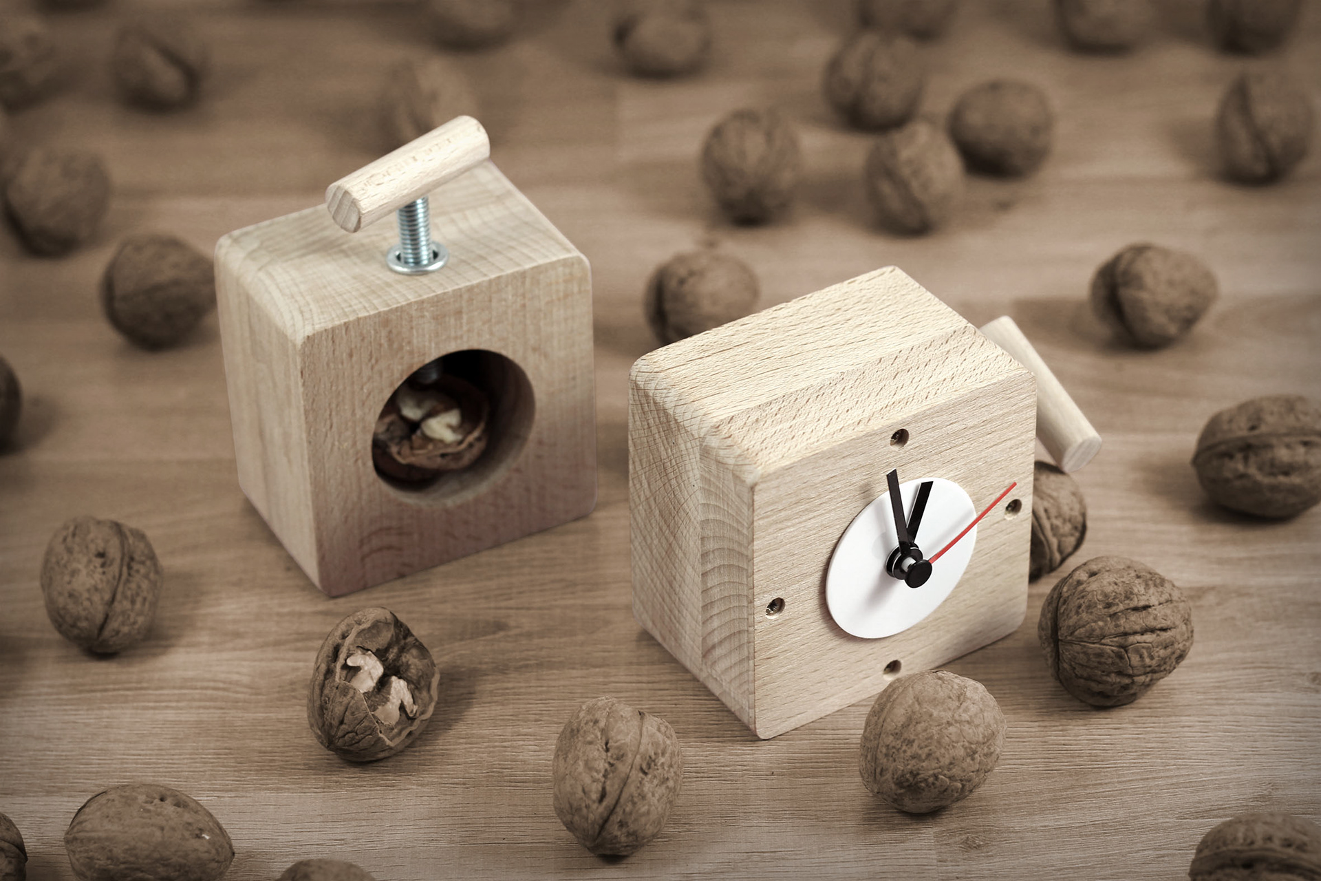 This is a collection of three clocks designed by Poorex – a nutcracker clock, a desk-organizer clock, and a hybrid of both. The first cracks a walnut hidden inside when wound, while the second functions as a vise, firmly holding post-it notes or attaching the clock to a shelf. They were produced and marketed, and in 2015 they received the “must have” quality mark from the Łódź Design Festival.