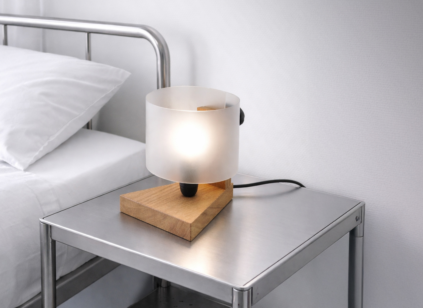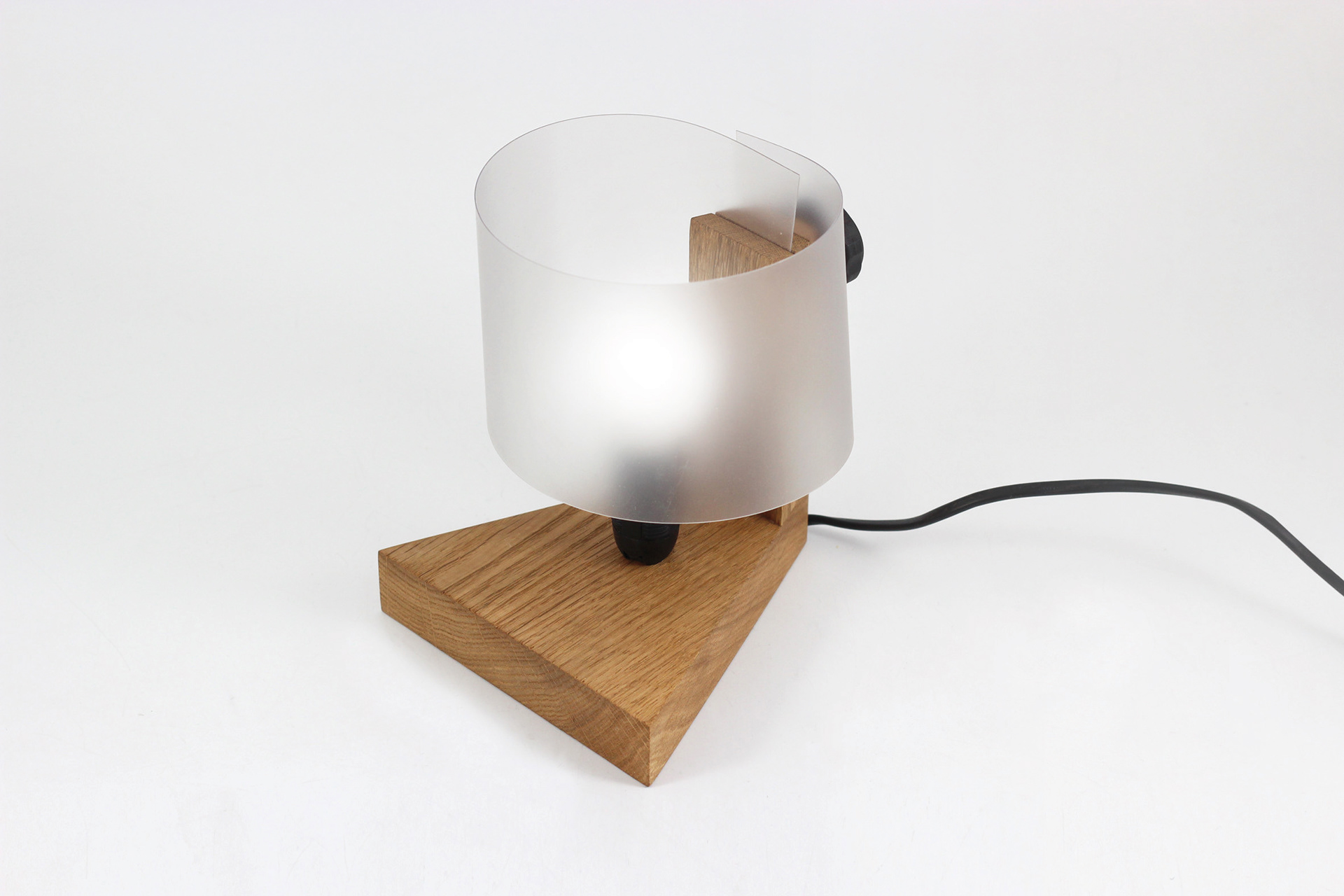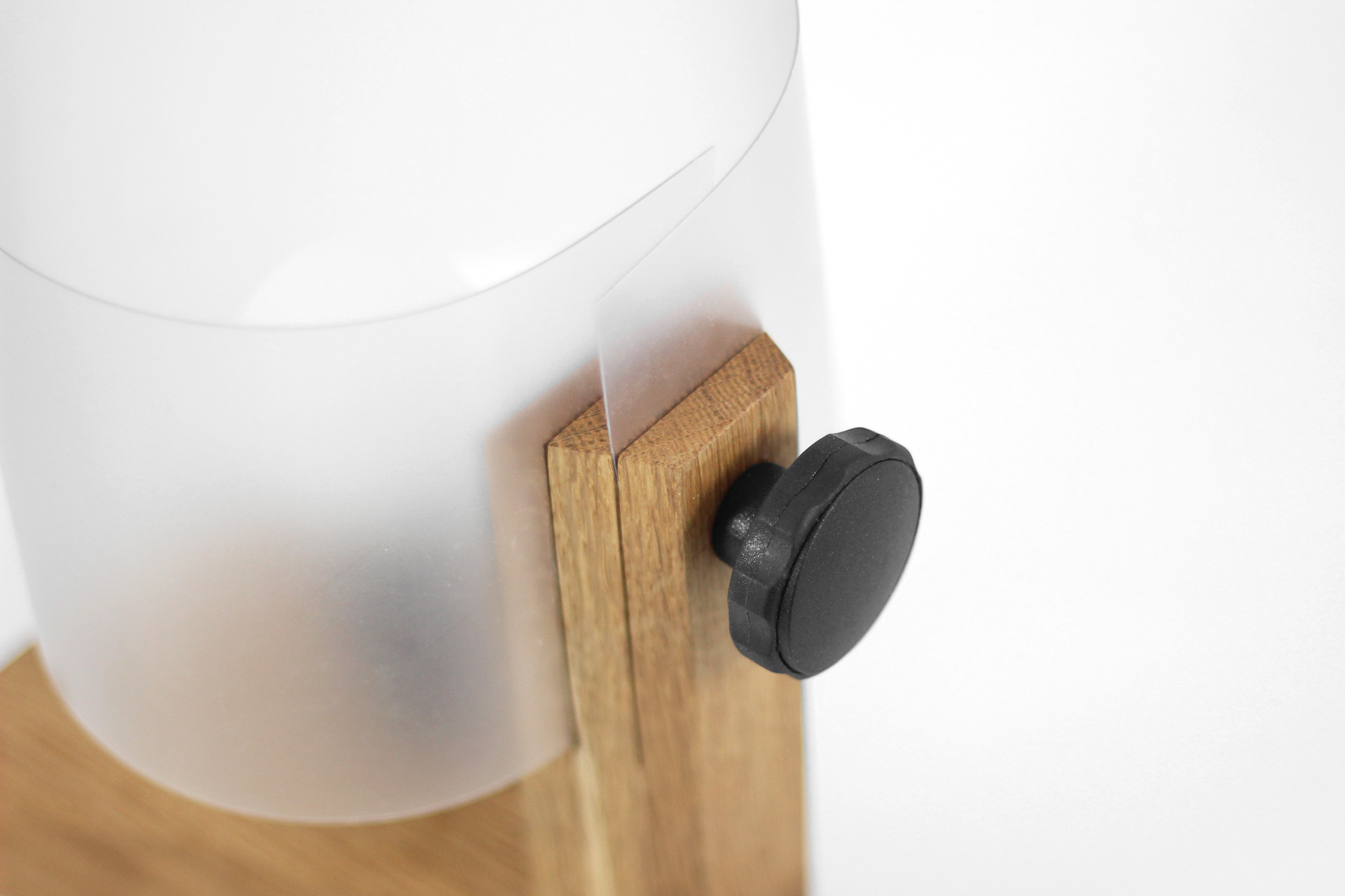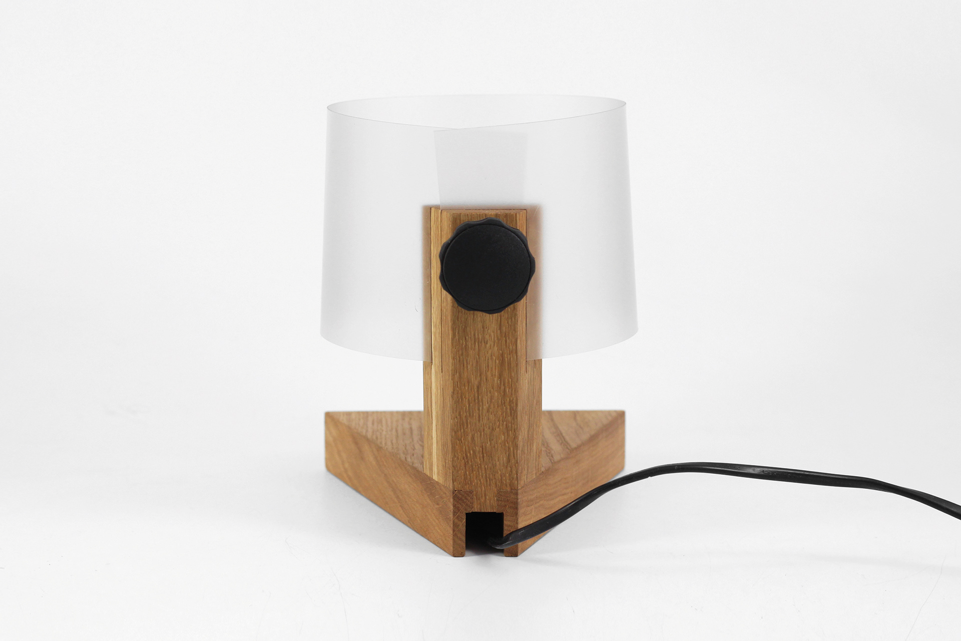 A minimalist bedside lamp whose operation has been deliberately made more complex and ritualistic. A stable wooden base conceals the socket and cable, while a vertical element with a tightening knob acts as a keystone that clamps the polypropylene foil shade. The shade, inserted into cuts and compressed by turning the knob, appears as a structural rather than decorative element. Switching the lamp on does not involve a simple button, but the act of “activating” a mechanism, transforming the user into an amateur constructor and giving the object a distinctly technical, almost engineered character.